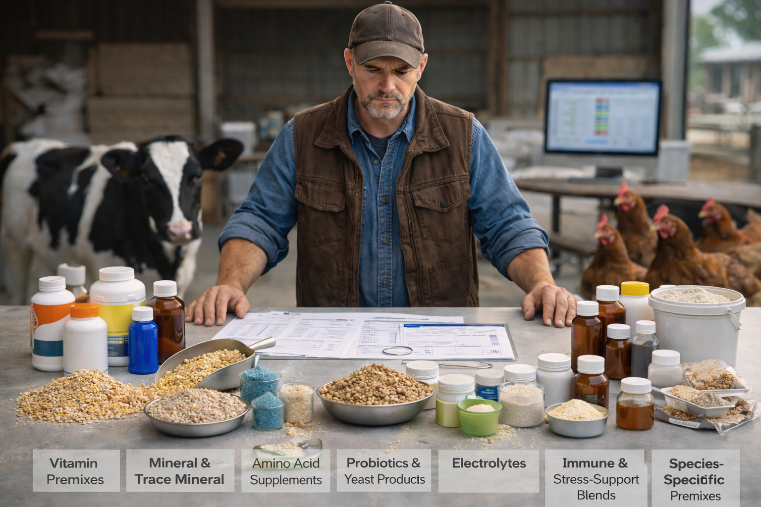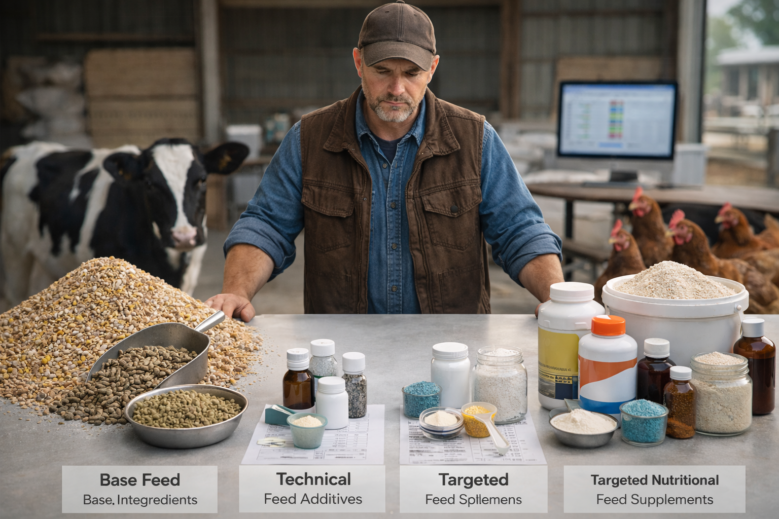 - Supplements and additives: Fine‑tuning layer that adjusts micronutrients, improves digestion or targets specific goals like immunity, reproduction or product quality.