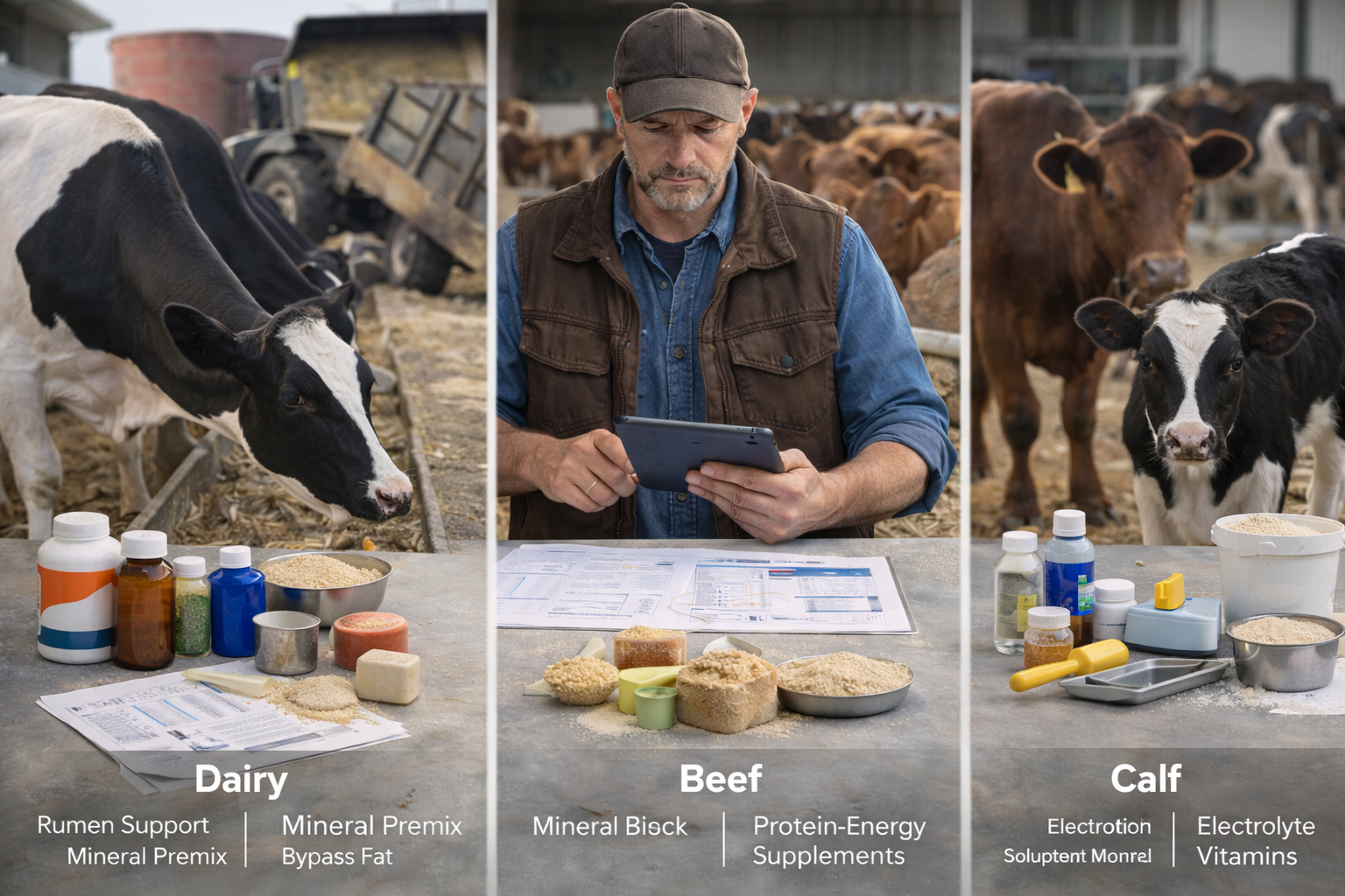 | Beef cattle | Growth, carcass, fertility | Pasture‑adapted minerals, protein/energy supplements, rumen modifiers |