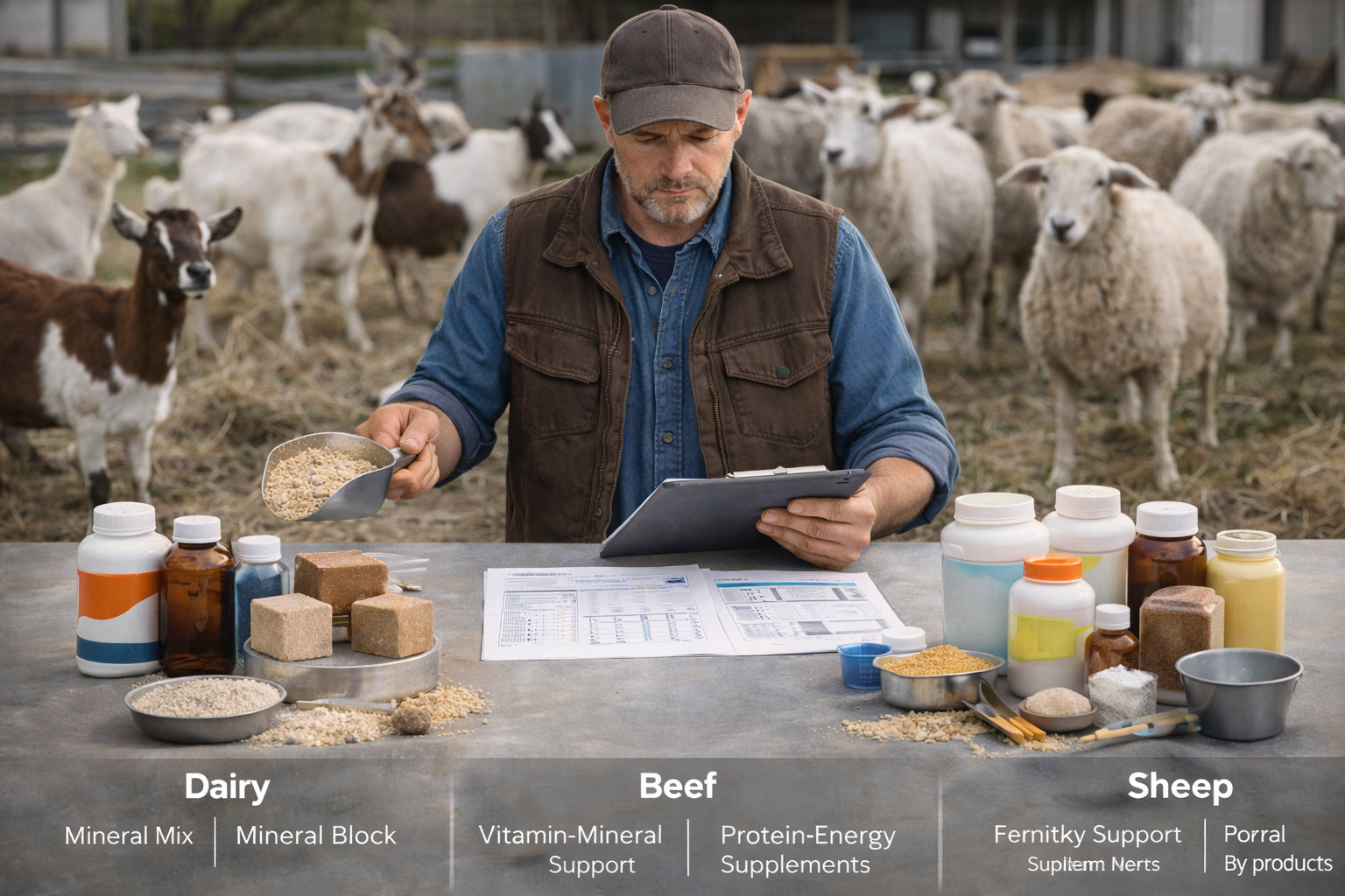 | Goats and sheep | Growth, fertility, milk | Species‑specific minerals/blocks, protein/energy supplements, by‑product integration |