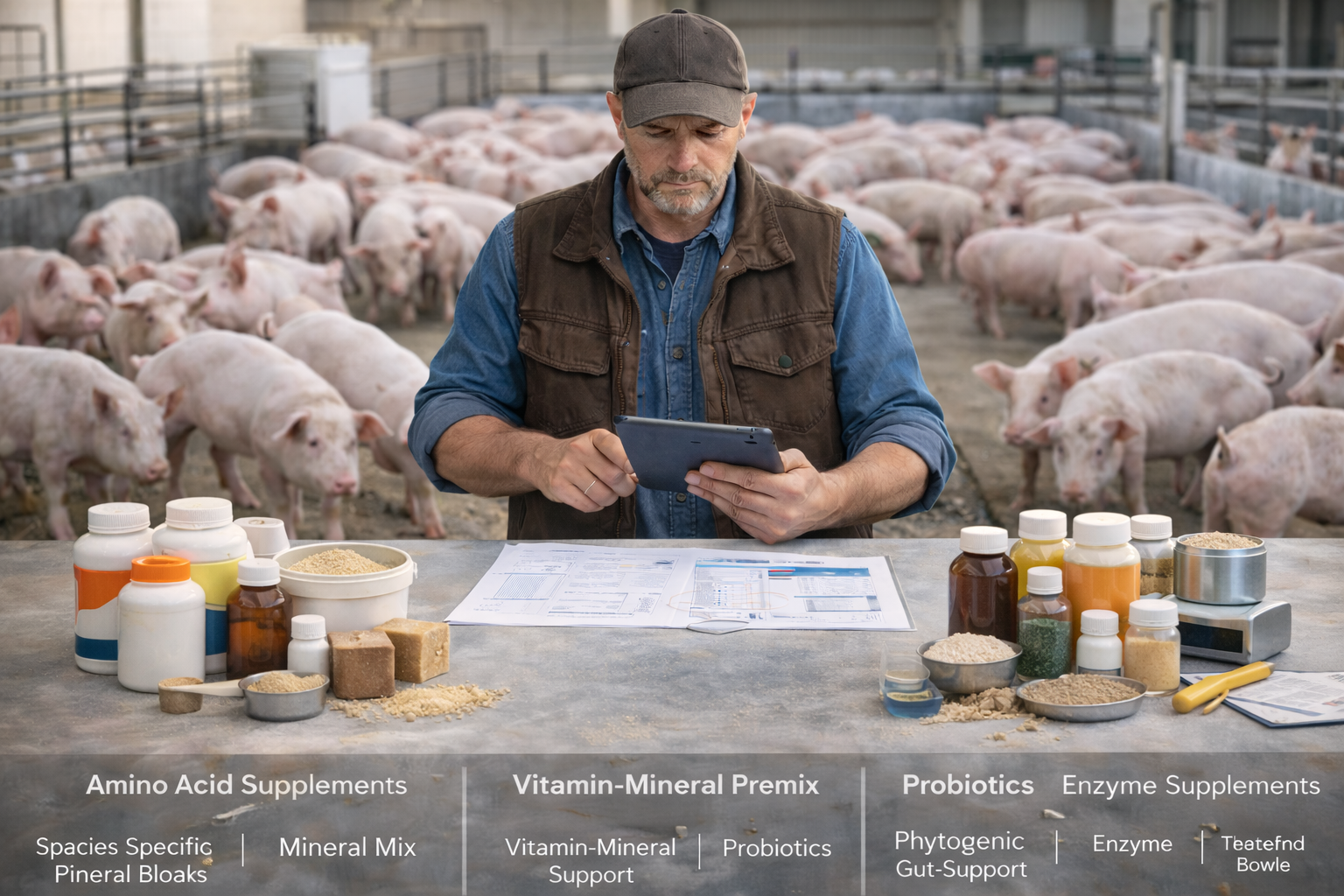 - Amino acids (lysine, methionine, threonine) via premix or feed formulation.